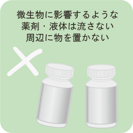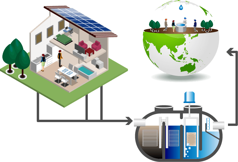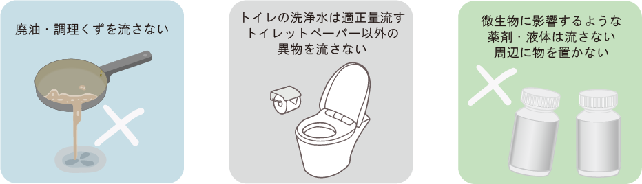 日々の生活の中での様々な排水を、槽の中の微生物の働きを利用して、浄化し放流する生活排水処理施設です。 トイレや風呂場などから流された汚水は、まず嫌気ろ床に入り、嫌気性微生物(酸素のないところで繁殖する微生物)が汚水に含まれる有機物を分解します。 その次に、担体流動生物ろ過槽に入ります。この槽では常に担体(ろ材)が流動し、表面に付着した微生物の働きによりさらに有機物を分解・除去します。 こうしてきれいになった上澄みの水は、消毒槽で消毒され放流されます。 この働きを維持させるために1年に1回清掃する(たまった汚泥を抜き取る)ことが必要です。